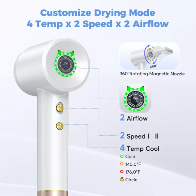 Your safety is a top priority with this dryer. It is equipped with an ALCI safety plug, providing enhanced protection, while the high-density dust screen prevents hair from being sucked into the motor. Additionally, the 360° rotating magnetic nozzle ensures precise airflow, making it easier to style your hair exactly the way you want it.