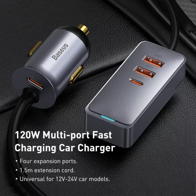 120W Multi-Port Fast Car Charger with USB & Type-C Ports + Extension Cord