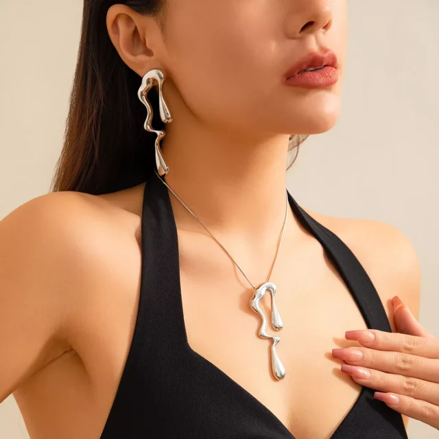 Turn heads and express your unique sense of style with this stunning 2-piece Water Drop Pendant Necklace and Stud Earrings Set. Featuring a creative irregular design inspired by flowing water, this jewelry set blends vintage charm with modern aesthetic to give your outfits a fresh and fashionable edge.