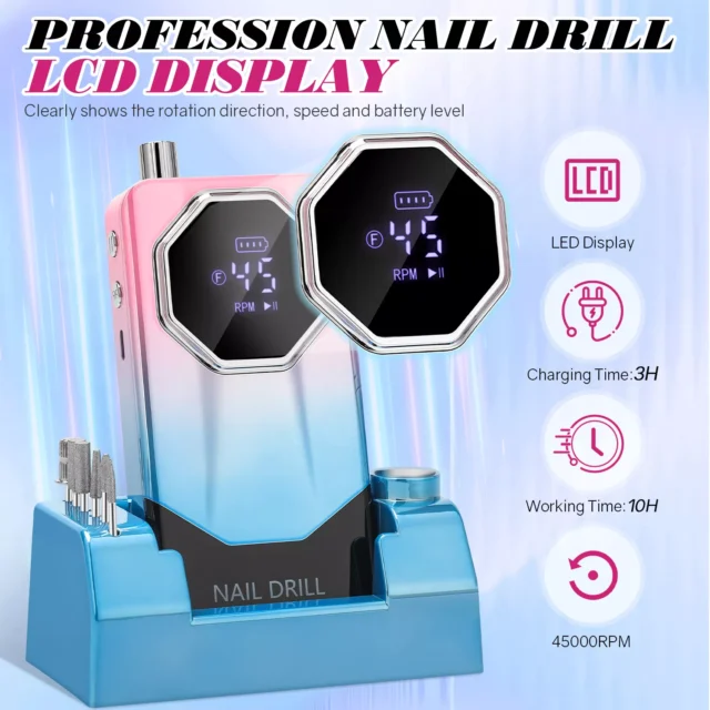 This versatile and efficient electric nail drill is more than just a tool—it’s a game changer for your at-home nail care routine. With a speed range of up to 45000RPM, it allows you to finish your manicures and pedicures in less time, delivering smooth and professional results. Its lightweight, rechargeable design means you can use it anywhere, whether you’re at home, on the go, or even on vacation. Plus, the low vibration and noise level ensure a comfortable experience every time you use it, while the USB charging feature makes it convenient to power up anytime, anywhere.