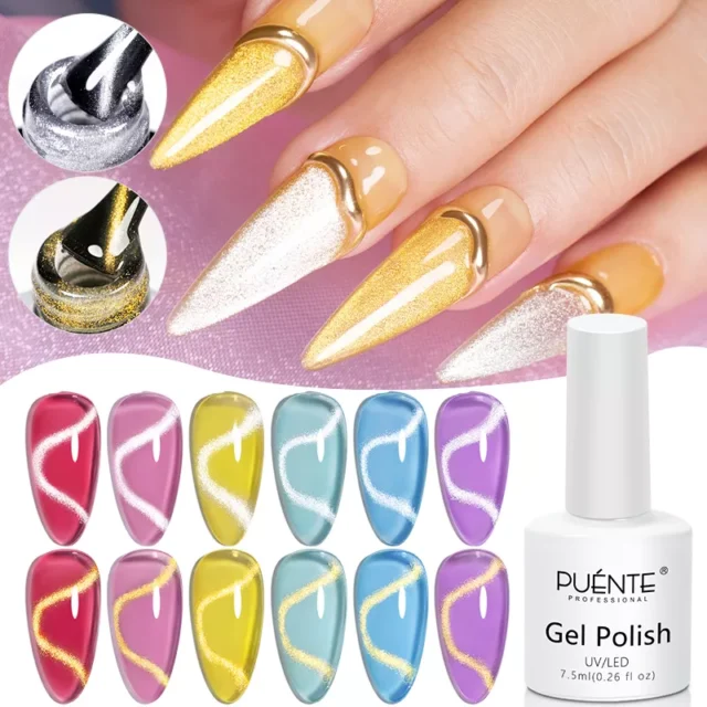 This premium gel formula combines high-shine brilliance with a magnetic cat eye finish for an effect that’s both elegant and edgy. The silvery and golden tones add depth and dimension, perfect for both day and night wear. Best applied using a magnet to achieve that iconic cat-eye shimmer, it’s a must-have for nail enthusiasts who love standing out with style.