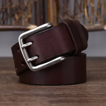 Men’s Genuine Leather Belt with Double Pin Buckle – 1.5 Inch Wide Vintage Style