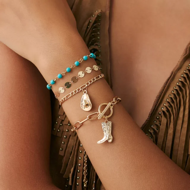 Bring rustic elegance and free-spirited charm to your look with this 4-piece boho bracelet set. Featuring unique cowboy hat and boots pendants, these bracelets are designed for women who love to express their individuality with style. The shimmering sequin chain bangles add a touch of sparkle, making them just as perfect for everyday wear as they are for dressing up on special occasions.