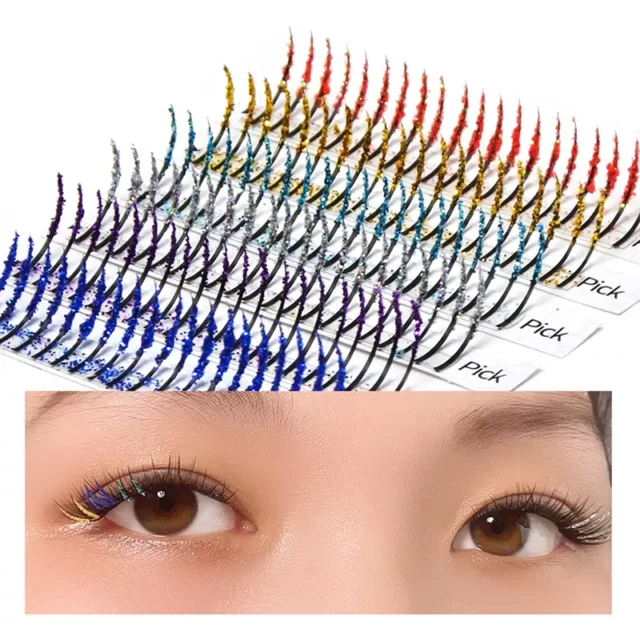 What sets these lashes apart from regular false eyelashes is their vibrant mix of colors and glittery shimmer. These are not your average lashes—they’re designed for those who want to make a bold statement and add a little magic to their look. The combination of fluffy, voluminous streaks and eye-catching color makes these lashes a must-have for anyone looking to add some sparkle to their eyes. Perfect for parties, festivals, and cosplay, these lashes let you express your personality and creativity in a fun and fashionable way.
