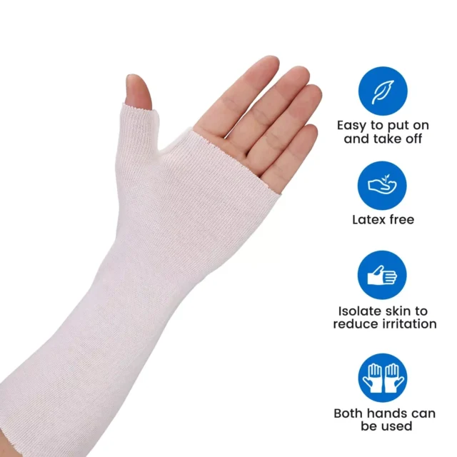 Made from a soft blend of polyester and cotton, these hand sleeves offer a snug, breathable fit without adding bulk. The built-in thumb sleeve adds extra support and protection where you need it most, while the smooth, seamless design reduces friction and pinching. Perfect to wear under splints, braces, or casts for all-day skin comfort.