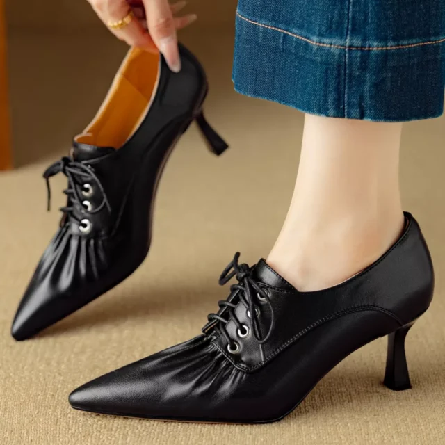 These women’s pointed toe lace-up pumps are designed for the modern woman who values both elegance and comfort. Handcrafted from premium sheepskin leather, these shoes bring together timeless style with everyday practicality. With their sleek 6.5-inch slim heel, they add just the right amount of height to elongate your silhouette while still being comfortable enough for daily wear. Whether you’re heading to the office, attending a dinner, or simply want to elevate your outfit, these pumps are the perfect choice.