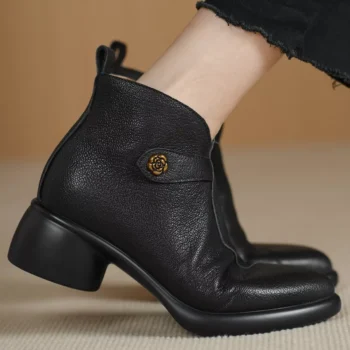 Women’s Genuine Sheepskin Round Toe Ankle Boots with Metal Buckle – 5cm Heel