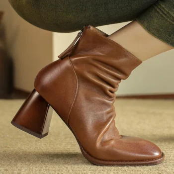 Elegant Women’s Pleated Leather Ankle Boots – 7cm Heel, Side Zip