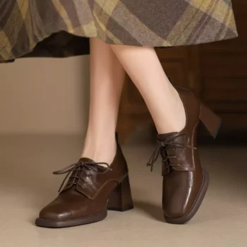 Women’s Leather Square-Toe Retro Lace-Up High Heel Pumps
