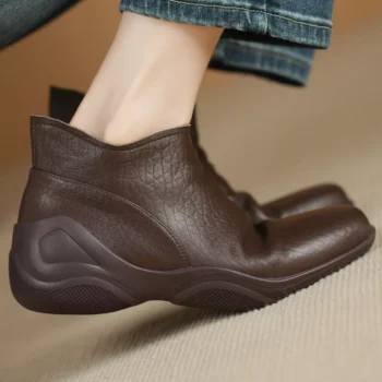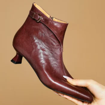 Women’s Genuine Sheepskin Round Toe Ankle Boots with Metal Buckle – 5cm Heel