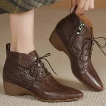 Women’s Genuine Sheepskin Lace-Up Ankle Boots with 4.5cm Wedge Heel