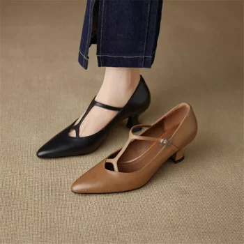 Genuine Leather Mary Jane Pumps for Women – Pointed Toe Mid Heel Shoes