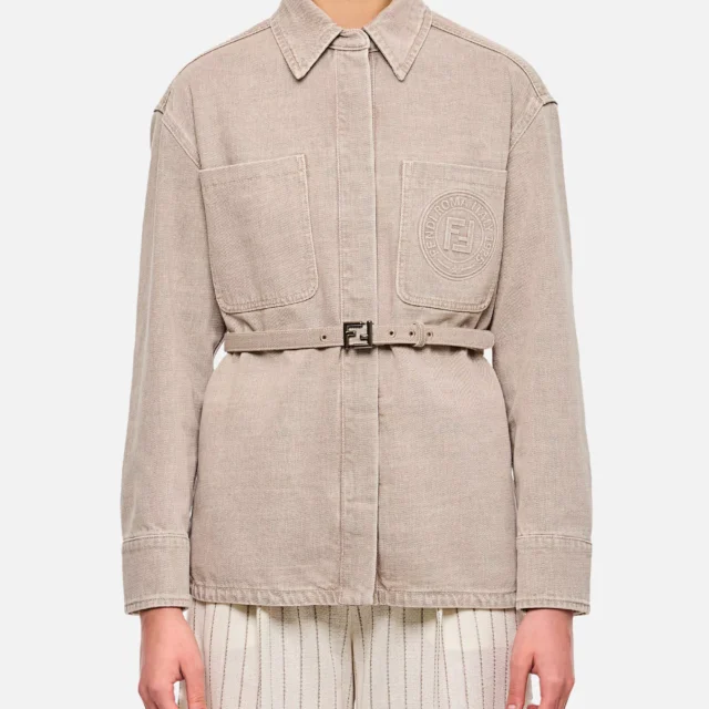 Crafted from premium cotton, this jacket features a classic collar and front button closure that gives it a structured, sophisticated silhouette. The two front patch pockets are not just functional; they’re elevated with Fendi’s embossed monogram, a subtle yet striking nod to iconic Italian design. Thoughtful additions like two side welt pockets and side slits bring both comfort and movement, while the adjustable, removable applique belt lets you define your shape or wear it relaxed and open.