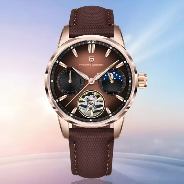 Step into a world where classic aviation-inspired design meets cutting-edge precision. This men’s luxury automatic watch combines striking aesthetics with advanced functionality, creating a timepiece that makes a statement every time you wear it. Featuring a numberless round dial, sapphire glass, and a mesmerizing moonphase complication, it’s a watch designed not just to tell time—but to elevate your presence.