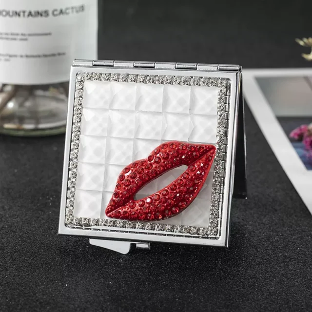 Stay stylish and flawless wherever you go with the Mini Crystal Red Lip Compact Mirror. Order now and add a touch of sparkle to your beauty routine!