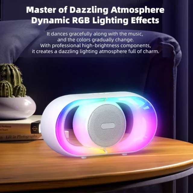 This isn’t just a speaker — it’s an experience. What sets it apart is the blend of atmospheric RGB lights and powerful sound output packed into a stylish, portable frame. You don’t need a whole sound system to create a vibe. Just this speaker, and you’re set.