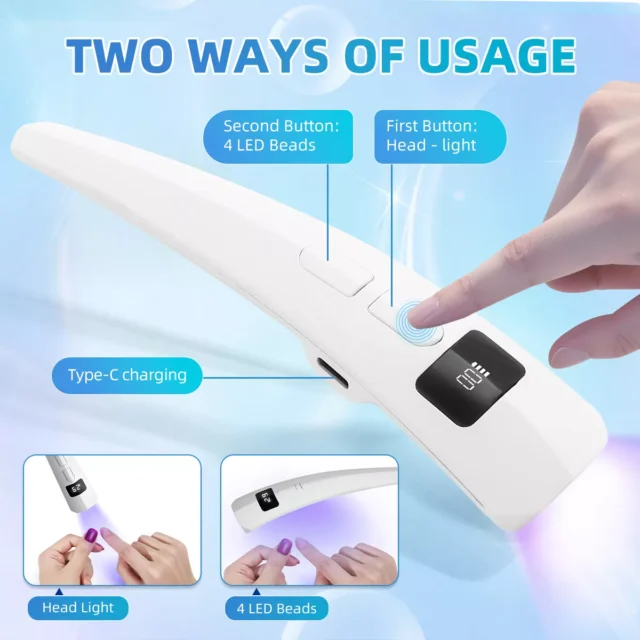• Dual Lighting Modes – Switch between two modes for different nail curing needs: use the 8X spotlight for individual nails, or the four LED beads for full hand coverage.