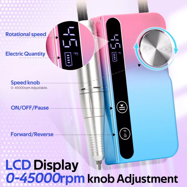 Transform your nail care routine with this powerful and stylish 45000RPM Electric Nail Drill Machine. Designed for both beginners and professionals, this portable nail drill is your ultimate tool for flawless manicures and pedicures—right from the comfort of your home. Whether you’re shaping, polishing, or removing gel and acrylic nails, this tool delivers smooth, precise results every time. Featuring an LED display, adjustable speed, and dual direction rotation, it gives you total control and effortless precision. Lightweight, rechargeable, and easy to carry, it’s perfect for on-the-go nail artists or anyone who loves DIY nail art.
