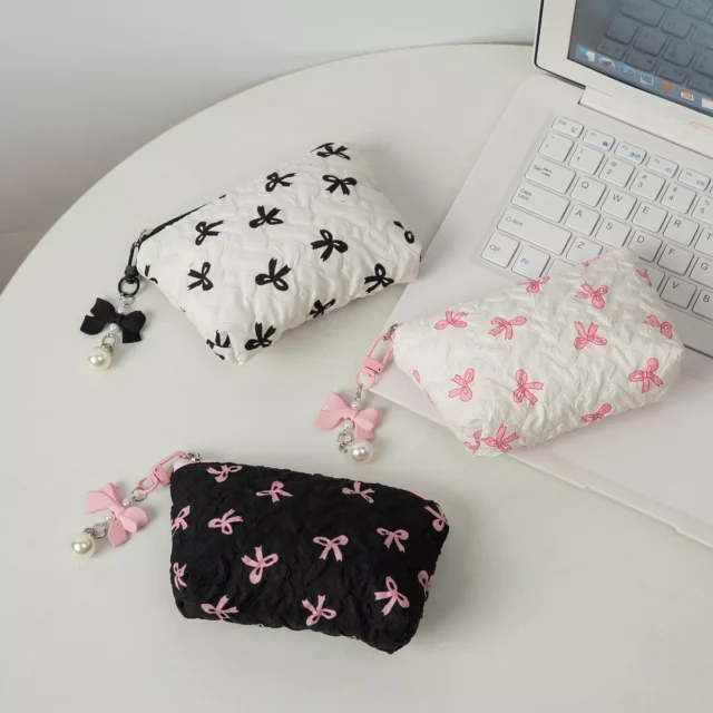 Quilted Bow Mini Makeup Bag – Travel Cosmetic Organizer for Women & Girls