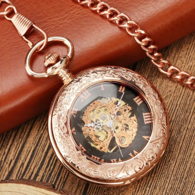 Rose Gold Mechanical Pocket Watch with Roman Numerals and Chain