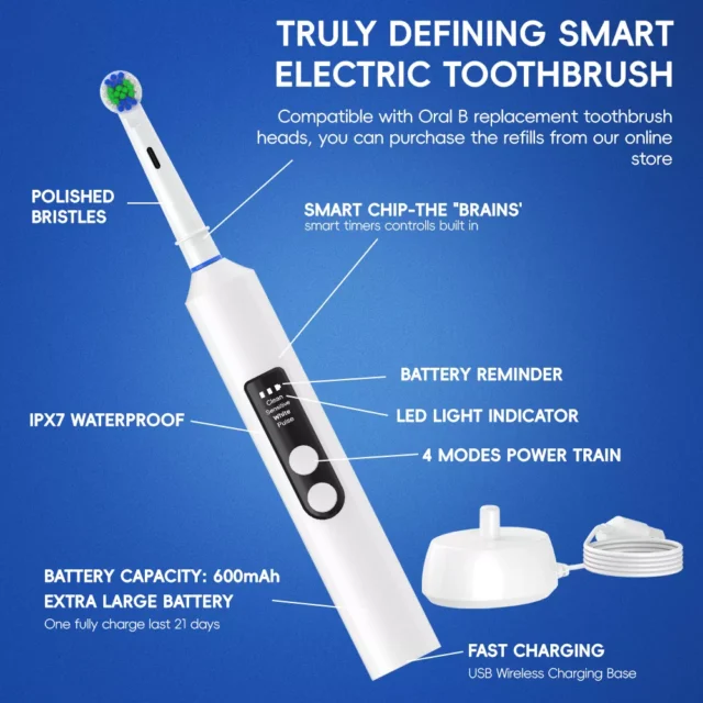 Upgrade your daily brushing routine with this advanced rotating electric toothbrush. Designed for deep cleaning and superior plaque removal, it features 4 powerful brushing modes, smart wireless charging, and a long-lasting battery. Whether you need a gentle clean or a high-intensity whitening session, this toothbrush adapts to your needs, leaving your teeth feeling fresh and polished after every use.