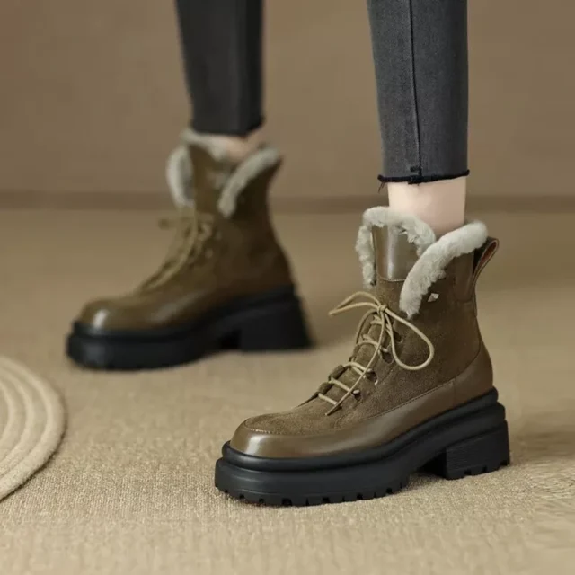 Women’s Cross-Tied Leather Ankle Snow Boots – Warm & Stylish Heels