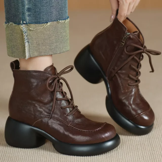 Women’s Sheepskin Lace-Up Punk Ankle Boots with Side Zip & Platform Heel