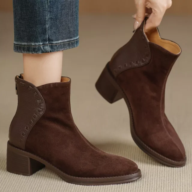 Women’s Sheepskin Leather Patchwork Ankle Boots – 5cm Heel, Back Zip